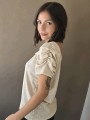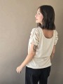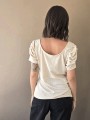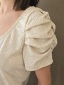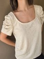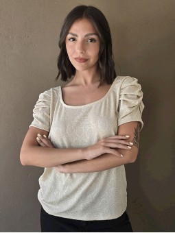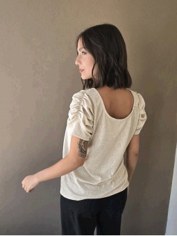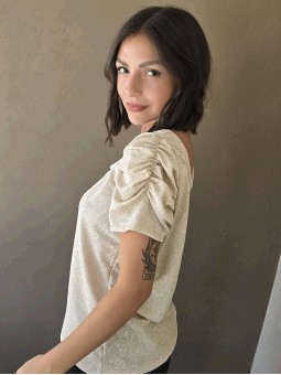Blusa de punto lurex elastizado, con cuello y espalda en U, con detalle de frunce en mangas.