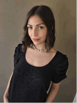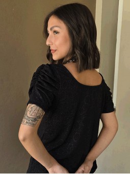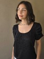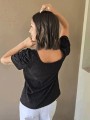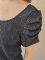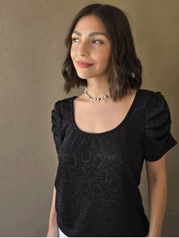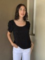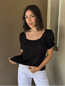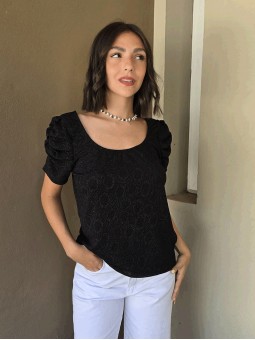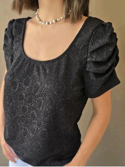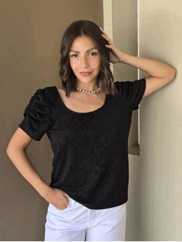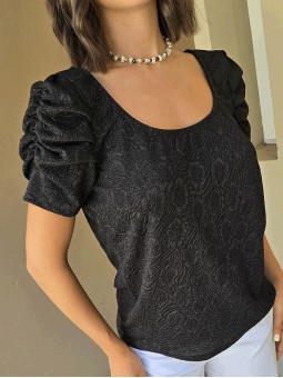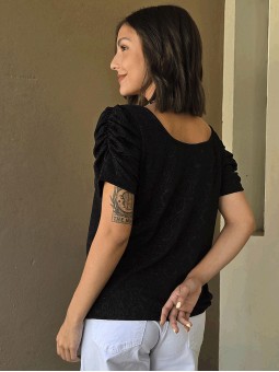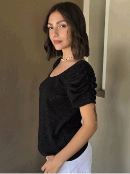 Blusa de punto lurex elastizado, con cuello y espalda en U, con detalle de frunce en mangas.