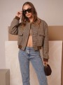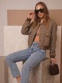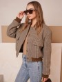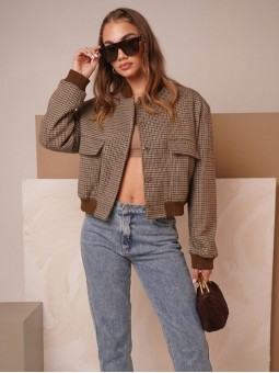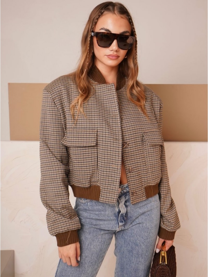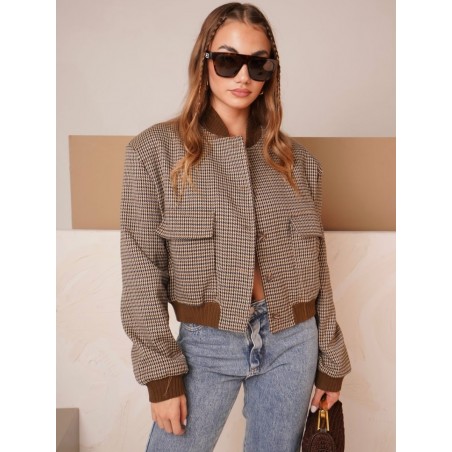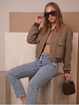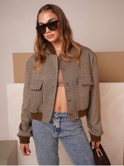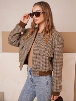 Campera corta, escosesa de paño liviano, combinada, con bolsillos delanteros y broches.