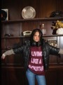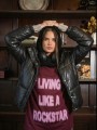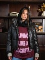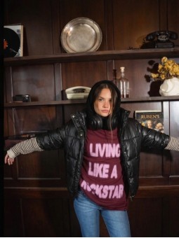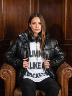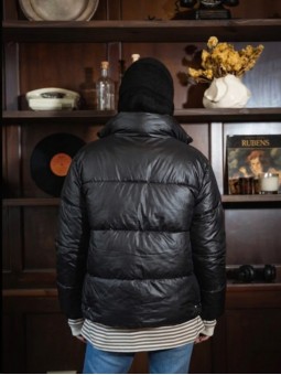 Puffer engomada con broches y cierre frontal. Con bolsillos y broches en la cintura para ajustar.
