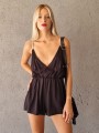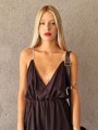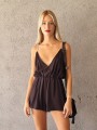 Mono corto de fibrana con escote cruzado con breteles strass y elastico en la cintura.