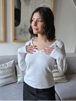 Vestido de lycra manga larga con detalle de cadena en escote.
